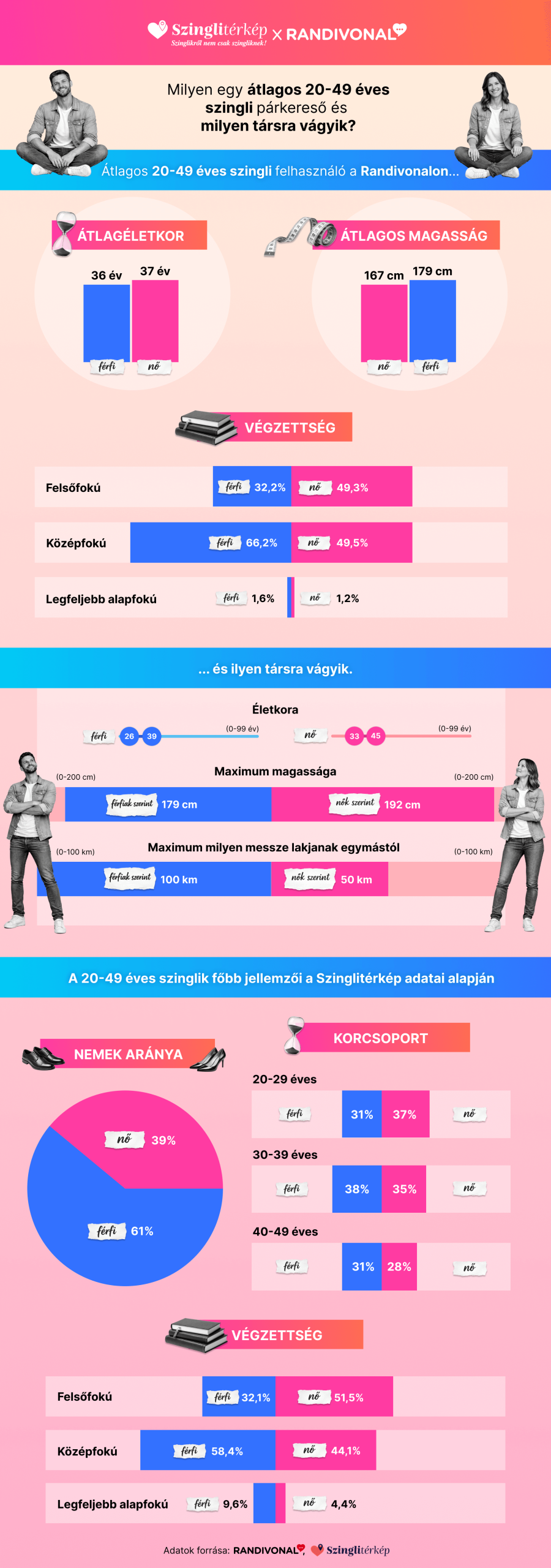 Tízből nyolc felhasználó a Randivonalon komoly párkapcsolatra vágyik. Csaknem minden harmadik párkereső 30 év alatti, minden második pedig a 30 és 45 év közötti korcsoportba tartozik” – emeli ki Weiler Péter a Randivonal.hu vezérigazgatója. A népszámlálások alapján nagy felbontású képet készíthetünk a szinglikről, de arról már kevesebbet tudunk, hogy milyen számukra az ideális társ. „Éppen ezért megnéztük, hogy néz ki”, milyen a vágyott társ a szinglitérkép alapján szinglinek tekinthető, 20-49 éves Randivonal.hu felhasználók szerint” – mutat rá a vezérigazgató.